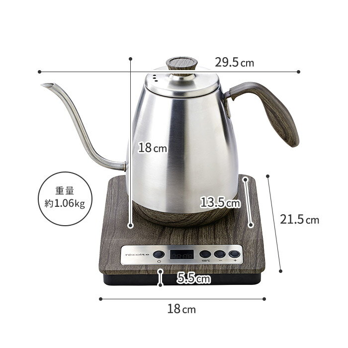 DETAIL サイズ ケトル本体(フタ含む):約 幅29.5 × 奥行13.5 × 高さ18cm 電源プレート:約 幅18 × 奥行21.5 × 高さ5.5cm コードの長さ:約0.7m 重量 ケトル本体(フタ含む):約0.56kg 電源プレート:約0.50kg 容量 最大800ml(最低利用容量:約250ml) 材質 ケトル本体:ステンレス、電源プレート:ABS樹脂 消費電力 1,000W 定格電圧 100V 50/60Hz 機能 温度設定(20℃〜99℃、100℃)、保温機能(約20分)、メモリー機能、自動電源OFF機能 保証 あり(1年) キッチン家電 ランキング